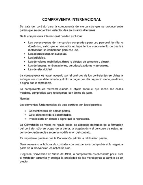 Rellene los espacios en blanco y elija las cláusulas de este contrato internacional que mejor se adaptan a sus necesidades. E l contrato de compraventa es aquel documento por escrito que evidencia el acuerdo de voluntades celebrado entre partes domiciliadas en países diferentes a través del cual se transfiere la propiedad de mercancías que serán transportadas a otro territorio teniendo como contraprestación el pago de un precio. Naciones unidas sobre los contratos de compraventa internacional de mercaderías y en su defecto por los usos y prácticas comerciales reconocidas por éstas. A su vez el artículo subsiguiente señala.