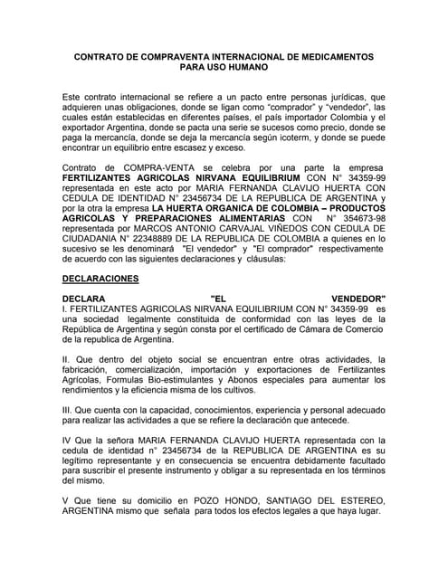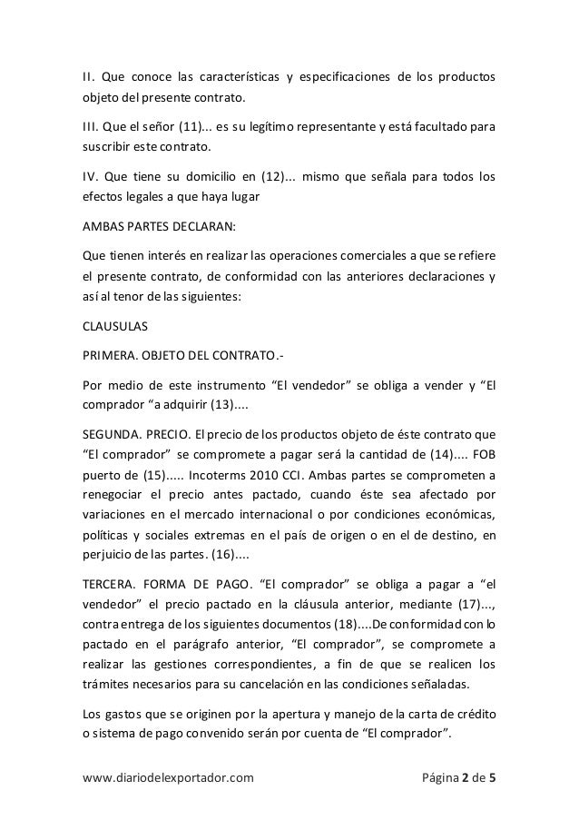 El contrato sirve para la compraventa internacional de distintos tipos de. Rellene los espacios en blanco y elija las cl aacute usulas de este contrato internacional que mejor se adaptan a sus necesidades. E l contrato de compraventa es aquel documento por escrito que evidencia el acuerdo de voluntades celebrado entre partes domiciliadas en países diferentes a través del cual se transfiere la propiedad de mercancías que serán transportadas a otro territorio teniendo como contraprestación el pago de un precio. En el formato que vienen es muy simple usarlos te regalamos uno relleno con muchas hojas que puedes usarlo como base para elaborar un contrato propio modificando las cláusulas que desees siempre que se encuentren dentro del marco legislativo vigente.