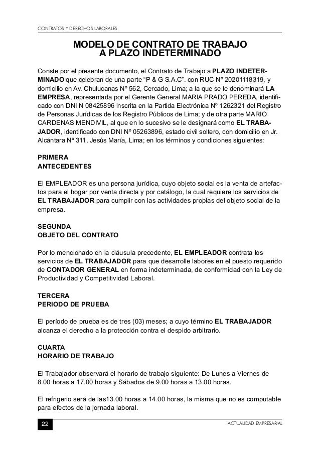 El empleador contrata los servicios de el trabajador para que realice las labores indicadas en la cláusula primera y desarrolle a favor de el empleador toda su capacidad de trabajo así como cumplir con las normas contenidas en el reglamento interno de trabajo de la empresa. Salaverry 655 jesús maría central telefónica. Cada uno se lo puede descargar en su formato word a través de facebook twitter o google. En la práctica es uno de los contratos de trabajo más utilizados y que por su naturaleza el hecho de que no tenga una fecha de finalización determinada más trabajadores desean y más bonificaciones reciben por parte del estado.