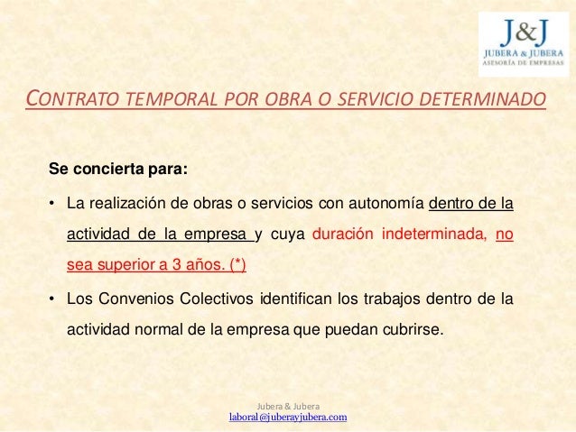 El 20 de abril del 2015 entró en vigencia la ley orgánica para la justicia laboral y reconocimiento del trabajo en el hogar lojl mediante la cual se creó un nuevo tipo de contrato de trabajo. Se establecen cuando la empresa contrata al empleado para completar una obra o servicio. Tipos de contratos temporales por obra o servicio. En el contrato tiene que venir indicada exactamente la obra o el servicio al que va a estar adscrito el trabajador con suficiente claridad y precisión.